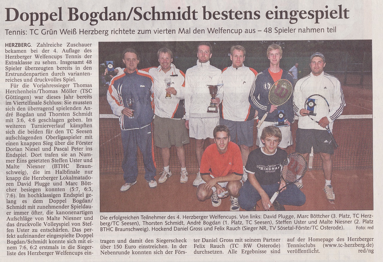 1 Bogdan André, Schmid Thorsten TC Seesen 7:6/6:2 2 Uster Steffen, Niesner Malte BTHC Braunschweig 6:7/2:6 3 Plugge David, Böttcher Marc TC Herzberg / TC Seesen 6:3/6:2 4 Niesel